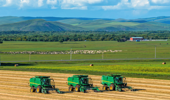 內蒙古呼倫貝爾農墾拉布大林農場的工人駕駛農機收獲小麥(2025年8月20日攝)。馬金瑞攝/本刊