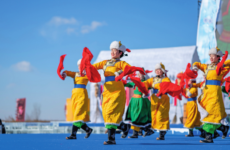 哈素海第四屆冬捕節(jié)暨冰雪旅游系列活動在內蒙古呼和浩特市土默特左旗開幕。這是開幕式上的文藝表演(2026年1月10日攝)。連振攝/本刊