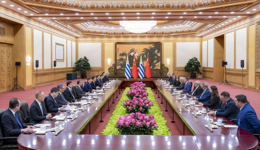 習(xí)近平指出,當(dāng)今世界正處于百年未有之大變局,國際形勢變亂交織,單邊霸凌愈演愈烈,中方支持烏拉圭接任“77國集團(tuán)和中國”輪值主席國,愿與烏方加強(qiáng)全球南方團(tuán)結(jié)協(xié)作,共同推進(jìn)平等有序的世界多極化、普惠包容的經(jīng)濟(jì)全球化,攜手并進(jìn)、共謀發(fā)展,為構(gòu)建人類命運(yùn)共同體作出更大貢獻(xiàn)。中方始終重視中拉關(guān)系,支持拉美和加勒比國家維護(hù)自身主權(quán)、安全、發(fā)展利益,支持烏拉圭接任拉美和加勒比國家共同體以及南方共同市場輪值主席國,愿同烏方和地區(qū)國家推動共建中拉命運(yùn)共同體走深走實(shí)。