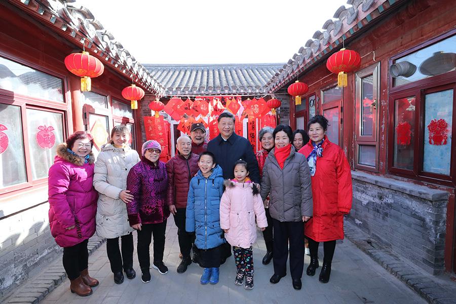 2019年2月1日上午,習(xí)近平總書記來(lái)到前門東區(qū)草廠四條胡同看望慰問群眾時(shí),同市民侯雅明一家合影。新華社記者 鞠鵬 攝