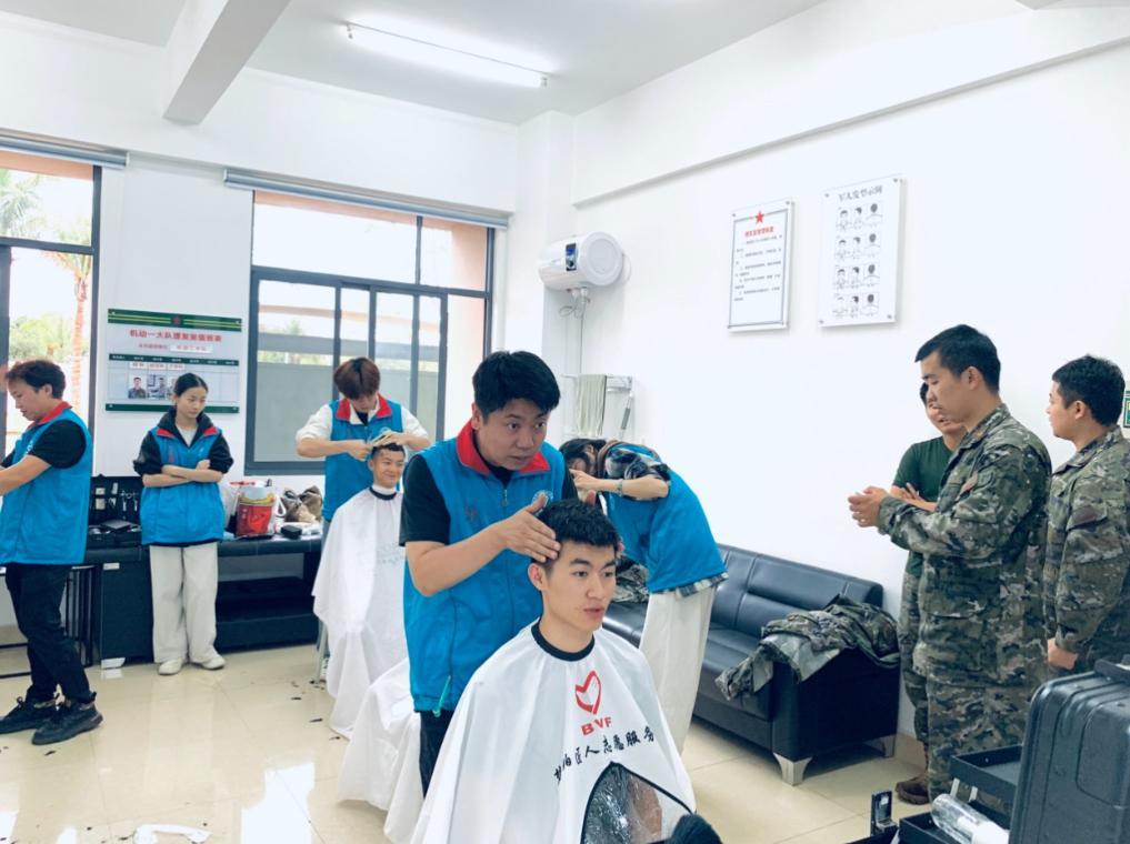 學(xué)雷鋒紀(jì)念日前夕,在海南省海口市某武警支隊(duì)營區(qū),2022年度全國學(xué)雷鋒志愿服務(wù)“四個(gè)100”最美志愿者孫凱帶著北京“梵珀匠人志愿服務(wù)隊(duì)”和海南省技師學(xué)院的師生來到這里,為武警戰(zhàn)士義務(wù)理發(fā)?!八麄兪刈o(hù)海疆安全,我們就用剪刀和推子為他們做好服務(wù)?!睂O凱說。