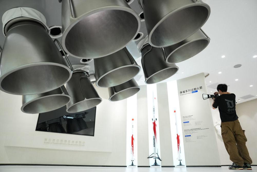 一名記者在北京經(jīng)濟(jì)技術(shù)開發(fā)區(qū)藍(lán)箭航天空間科技股份有限公司拍攝朱雀系列運(yùn)載火箭的模型(2025年6月18日攝)。新華社記者 鄭煥松 攝