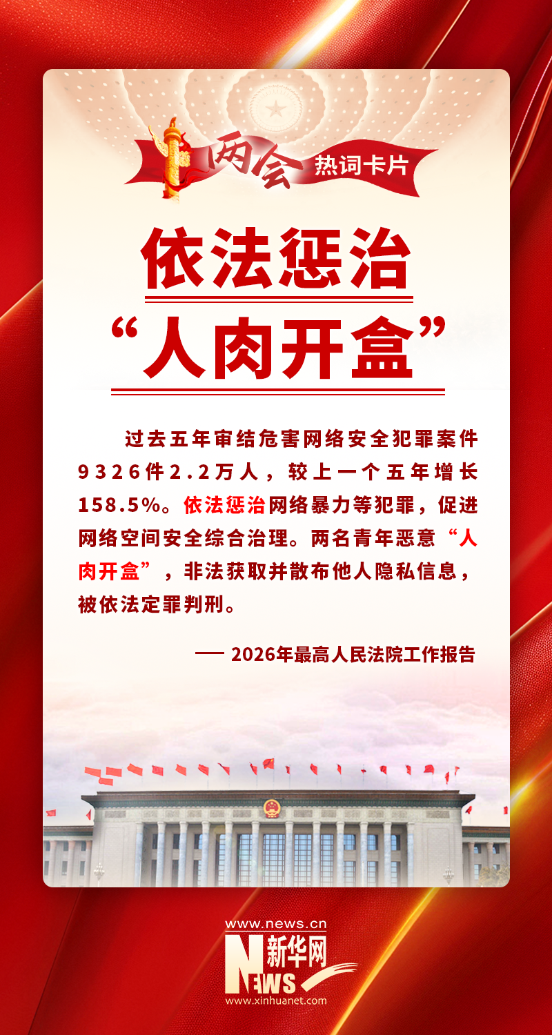 最高人民法院辦公廳副主任海偉:當(dāng)前新型犯罪案件數(shù)量增長較快,比如,過去五年法院審結(jié)的危害網(wǎng)絡(luò)安全犯罪案件,較上一個五年增長158.5%。繼2024年、2025年報告強調(diào)懲治“按鍵傷人”“按鍵殺人”行為后,今年報告又特別提到懲治“人肉開盒”這種新型網(wǎng)絡(luò)暴力犯罪,就是警示網(wǎng)絡(luò)空間決不是法外之地。