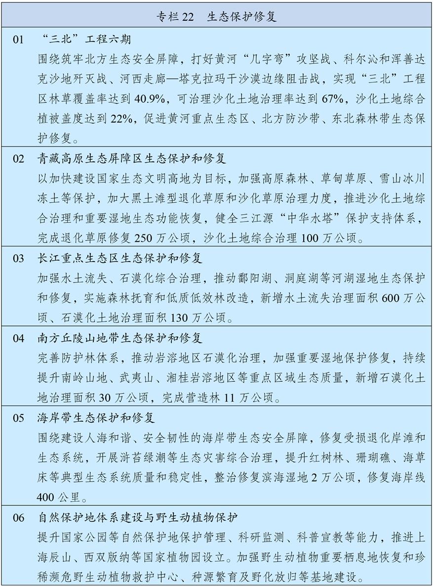 統籌推進重要生態(tài)系統保護和修復重大工程,持續(xù)鞏固以“三區(qū)四帶”為骨架的國家生態(tài)安全屏障體系。打好“三北”工程攻堅戰(zhàn),推動三大標志性戰(zhàn)役取得決定性勝利。深入推進青藏高原生態(tài)保護,加強重點區(qū)域水土流失治理和石漠化治理??茖W開展大規(guī)模國土綠化行動,推進森林質量精準提升和國家儲備林建設,森林蓄積量達到224億立方米,統籌草原生態(tài)修復與合理利用,加強濕地保護修復。推進超引地表水和超采地下水治理,開展歷史遺留廢棄礦山生態(tài)修復。