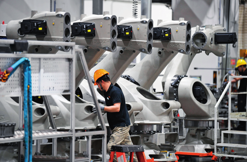 在廣東佛山市美的庫卡智能制造科技園拍攝的工業(yè)機(jī)器人產(chǎn)線車間(2025年3月25日攝)。鄧華攝/本刊