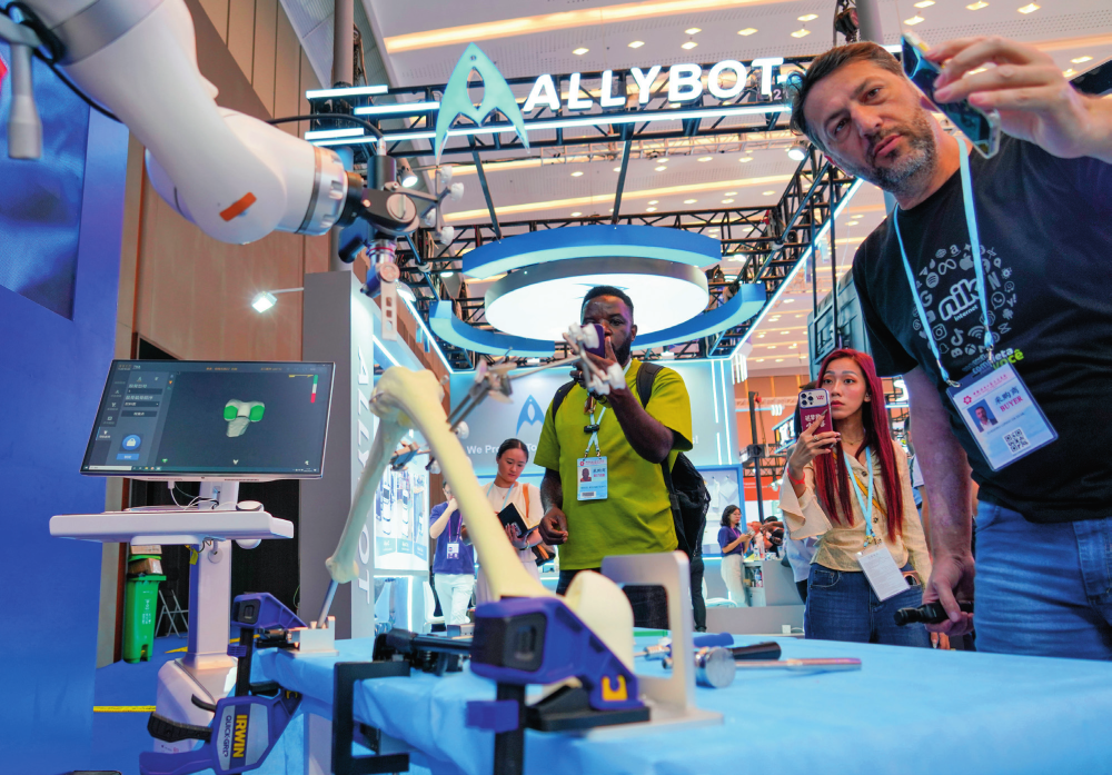 海外采購(gòu)商在第138屆廣交會(huì)元化智能科技(深圳)有限公司展臺(tái)觀看手術(shù)機(jī)器人產(chǎn)品(2025年10月19日攝)。肖恩楠攝/本刊