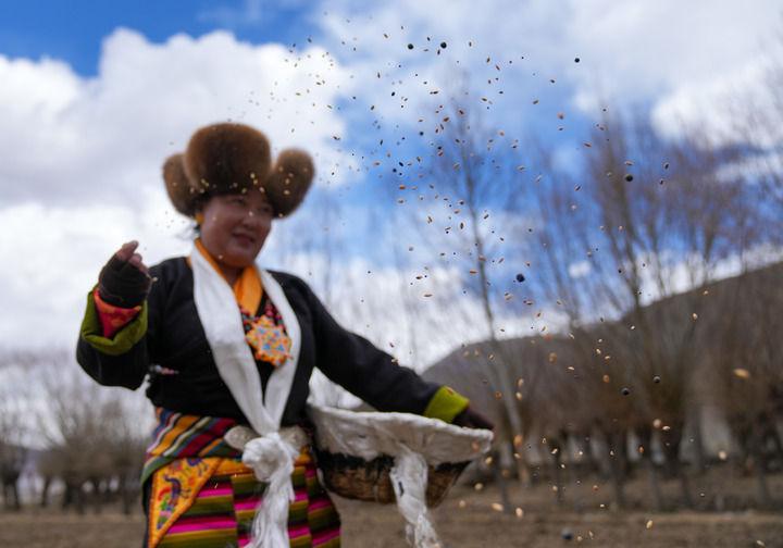 2026年3月16日,西藏山南市結(jié)巴鄉(xiāng)結(jié)巴村村民身著盛裝,在新犁開的田地上播撒種子。新華社記者 晉美多吉 攝