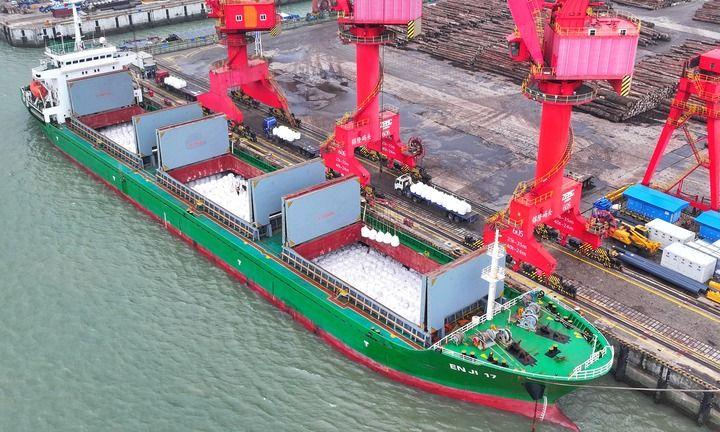 2026年3月18日,在江蘇張家港錦隆重件碼頭,國際航行船舶在泊位上有序卸運(yùn)進(jìn)口化肥(無人機(jī)照片)。新華社發(fā)(趙國政攝)