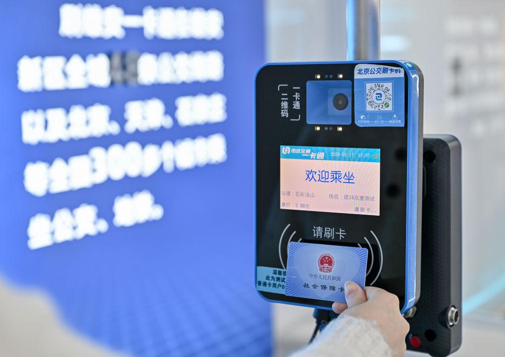 2026年3月17日,雄安一卡通體驗(yàn)館的工作人員演示刷社保卡乘坐公交車。