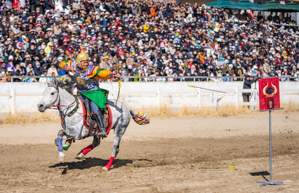 ??在拉薩賽馬場,騎手表演馬上射箭。 新華社記者 孫非 攝