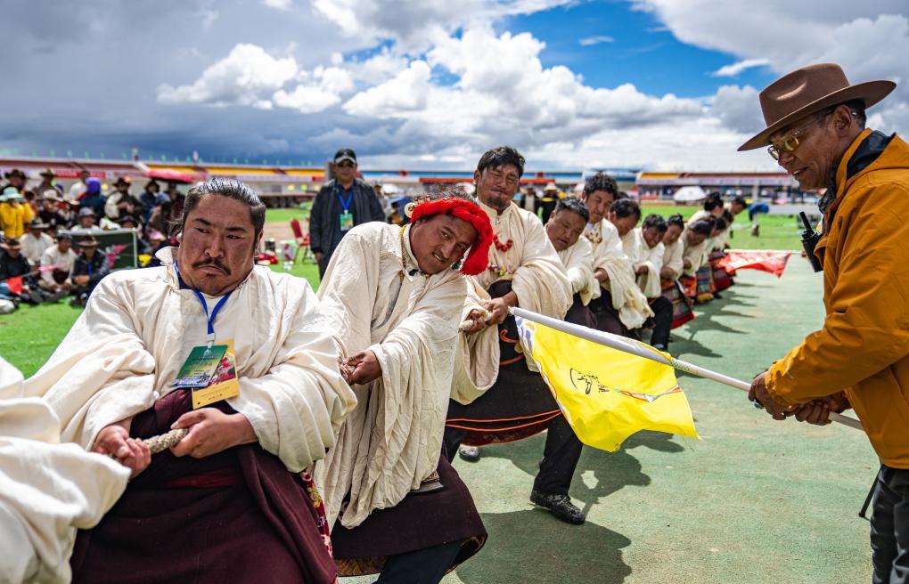 ??2025年9月6日,在那曲市恰青賽馬節(jié)現(xiàn)場,農(nóng)牧民參加拔河比賽。新華社記者 丁增尼達 攝