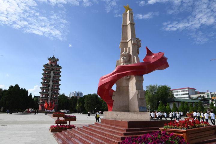 這是2019年7月22日在甘肅會寧縣紅軍會寧會師舊址拍攝的雕塑和會師紀(jì)念塔。新華社記者 馬寧 攝