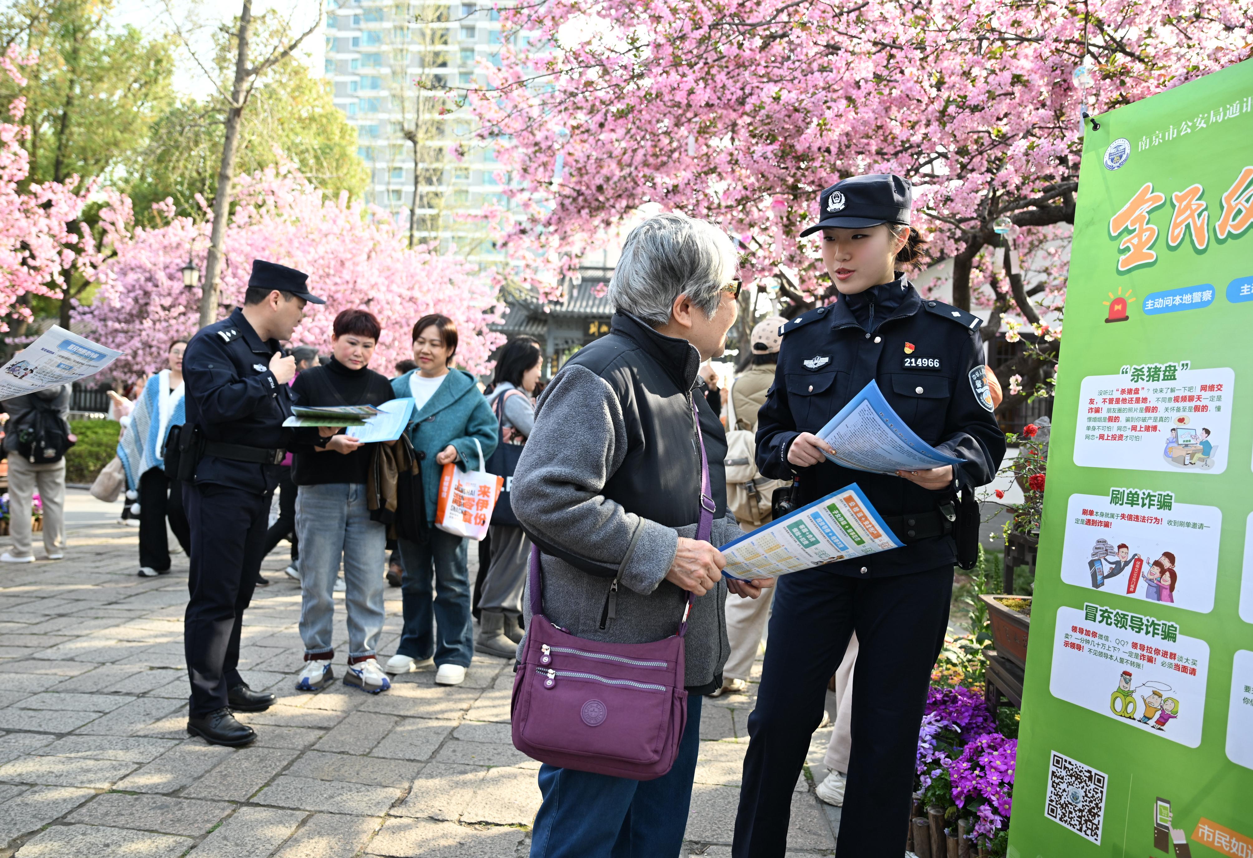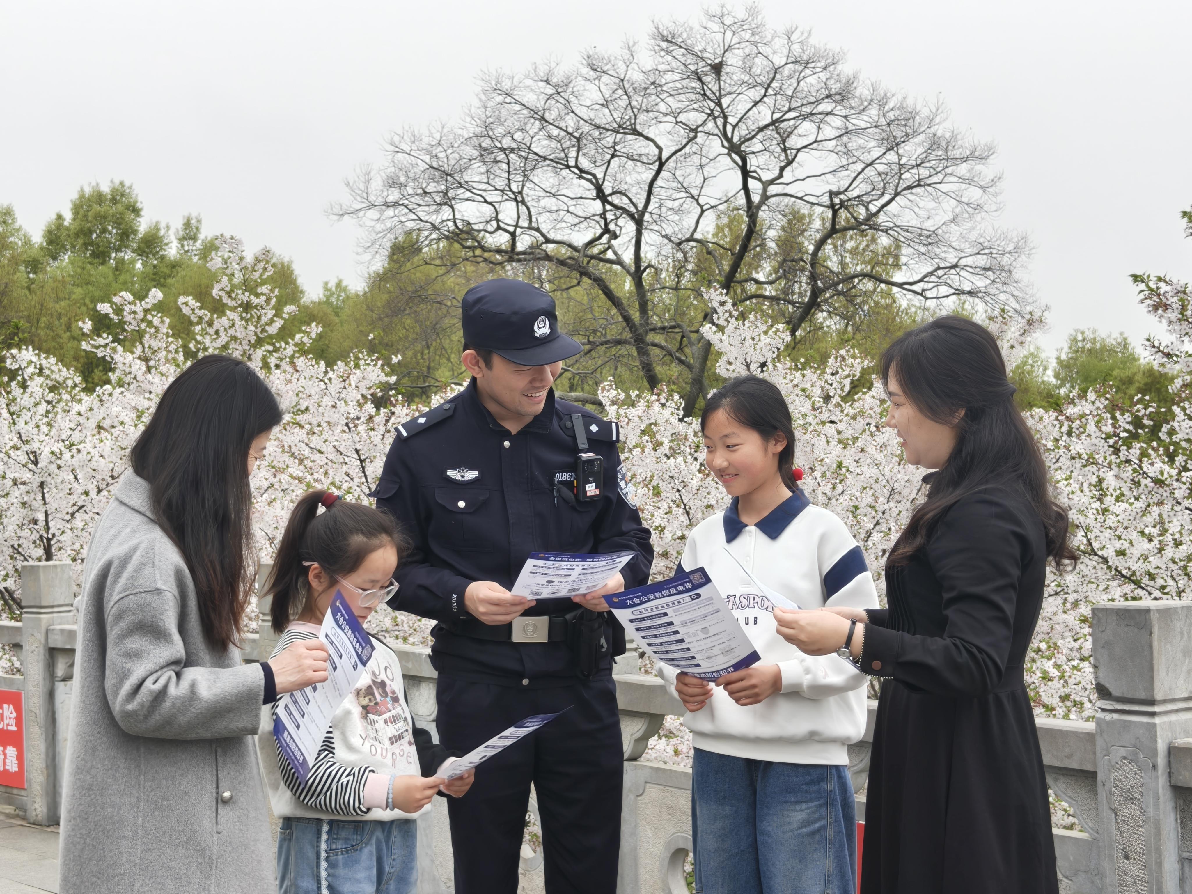 研學(xué)活動(dòng)聚集地,不僅是安保的重點(diǎn),也是反詐宣傳的“黃金陣地”。南京警方抓住假期人流集中的契機(jī),將反詐宣傳陣地前移至家長(zhǎng)和孩子們身邊?!鞍⒁蹋謾C(jī)支付停車費(fèi)要小心陌生鏈接!”“小朋友,說送你游戲皮膚的千萬別信!”在莫愁湖公園海棠花會(huì),建鄴公安分局民警將反詐知識(shí)融入春日游園,游客一邊賞花一邊聽防騙知識(shí)。