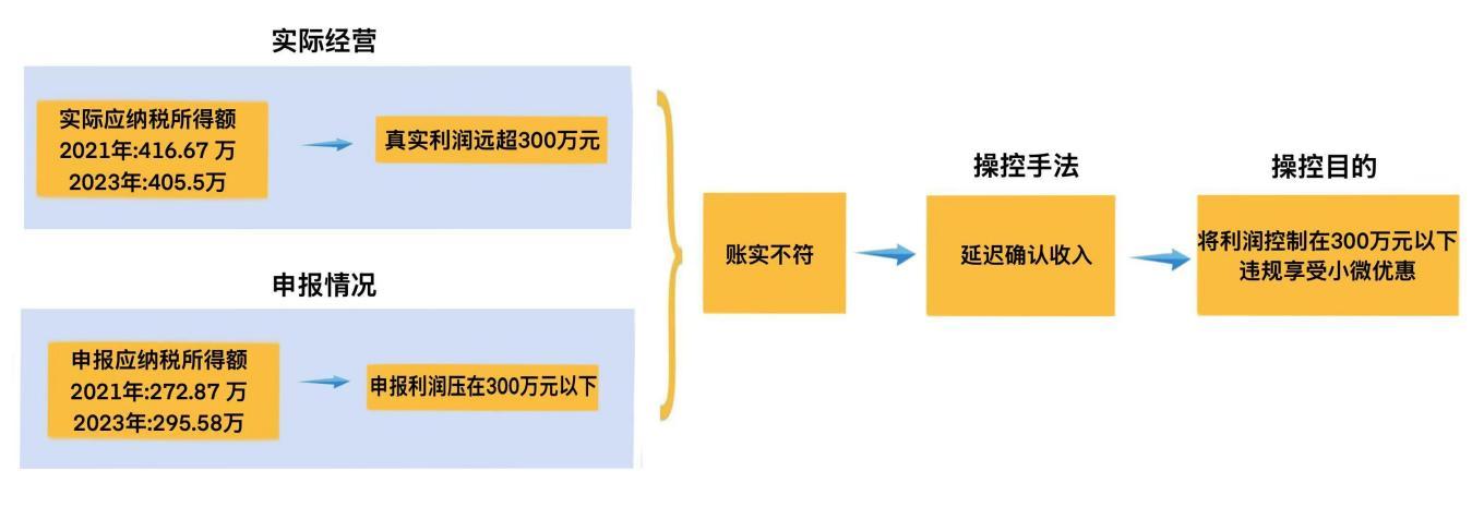 經(jīng)核實,2021年該駕校合同載明收入及銀行流水測算的應(yīng)納稅所得額為416.67萬元,申報為272.87萬元;2023年實際為405.5萬元,申報數(shù)為295.58萬元。企業(yè)刻意將應(yīng)納稅所得額控制在300萬元小型微利企業(yè)標(biāo)準(zhǔn)線以下,違規(guī)享受小微企業(yè)稅收優(yōu)惠政策。