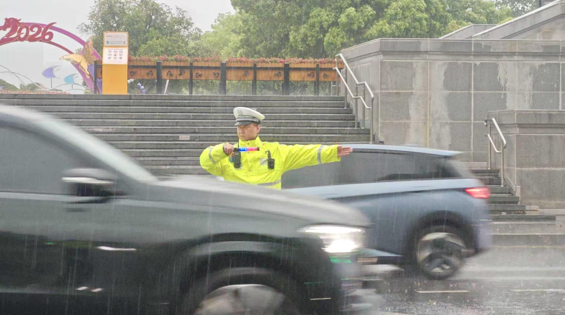 圖為武漢市公安局江岸區(qū)分局交通管理大隊(duì)民警在暴雨中指揮交通。