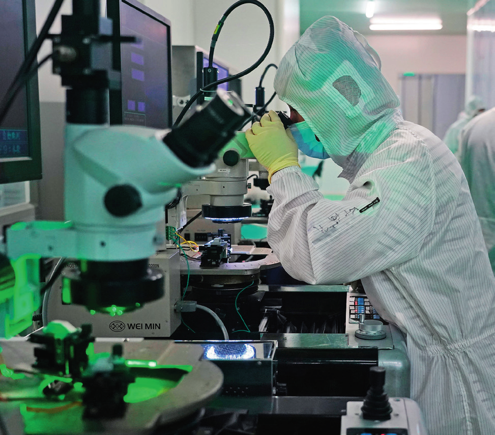 在位于江西省南昌市的南昌大學(xué)國(guó)家硅基LED工程技術(shù)研究中心,技術(shù)人員正在對(duì)芯片進(jìn)行電性測(cè)試(2024年4月3日攝)。萬象攝/本刊