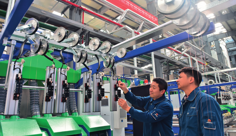 在江西江銅華東電工新材料科技有限公司生產(chǎn)車間,技術(shù)工人在生產(chǎn)線上巡檢設(shè)備(資料照片)。張善臣攝/本刊