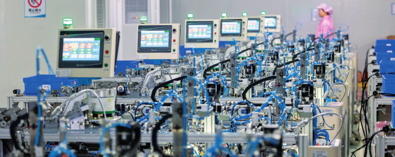 在江西贛州訊康電子科技有限公司,工作人員從T1—T2全自動(dòng)穿環(huán)機(jī)旁走過,該機(jī)器生產(chǎn)磁性元器件(資料照片)。才揚(yáng)攝/本刊