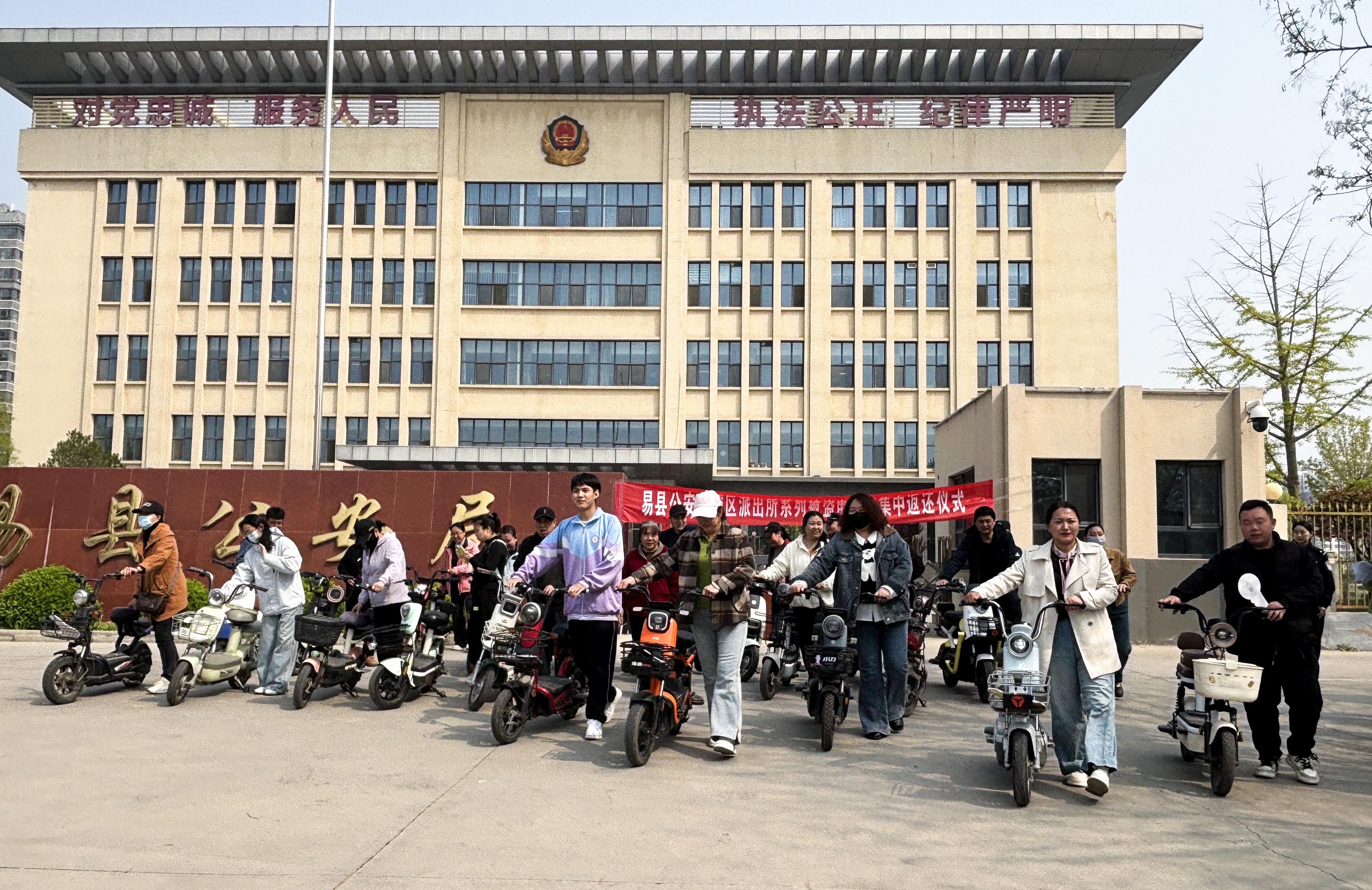 4月15日,河北省保定市易縣公安局舉行涉案電動車集中返還活動,將24輛追回的被盜電動車逐一返還失主?;顒蝇F(xiàn)場,24名車主領(lǐng)回了自己失而復(fù)得的電動車,紛紛對民警高效辦案、為民挽損表示感謝。