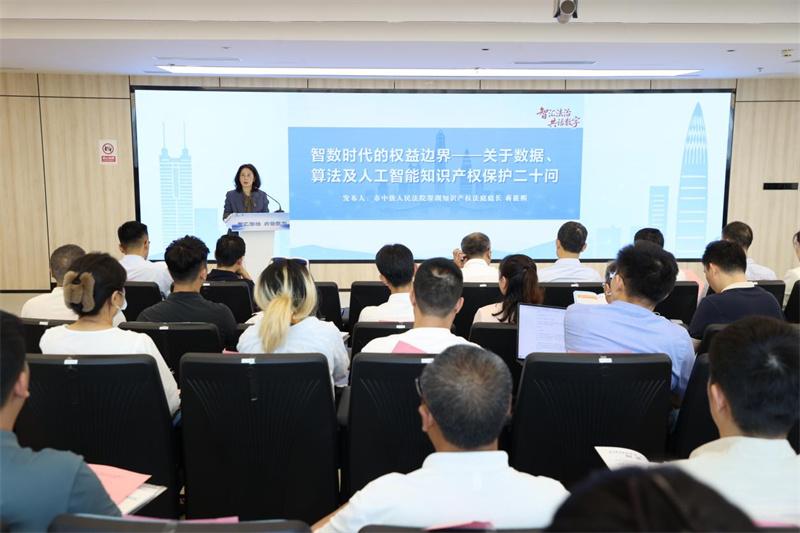 活動(dòng)伊始,市中級(jí)人民法院深圳知識(shí)產(chǎn)權(quán)法庭庭長蔣筱熙發(fā)布《智數(shù)時(shí)代的權(quán)益邊界——關(guān)于數(shù)據(jù)、算法及人工智能知識(shí)產(chǎn)權(quán)保護(hù)二十問》(以下簡稱《二十問》)?!抖畣枴肪o扣企業(yè)經(jīng)營和產(chǎn)業(yè)發(fā)展中的數(shù)據(jù)、人工智能相關(guān)痛點(diǎn),聚焦數(shù)據(jù)抓取合法性、算法商業(yè)秘密保護(hù)、AI生成內(nèi)容權(quán)利歸屬等高頻問題,將宏觀法律原則轉(zhuǎn)化為具體實(shí)踐指引,為企業(yè)提供“看得懂、用得上”的法律導(dǎo)航,打通立法原則與企業(yè)合規(guī)實(shí)踐的“最后一公里”。隨后,深圳知識(shí)產(chǎn)權(quán)法庭法官張婷解讀了《二十問》的起草背景與依據(jù),從法理、司法方法、產(chǎn)業(yè)實(shí)踐等方面進(jìn)行系統(tǒng)化闡釋。