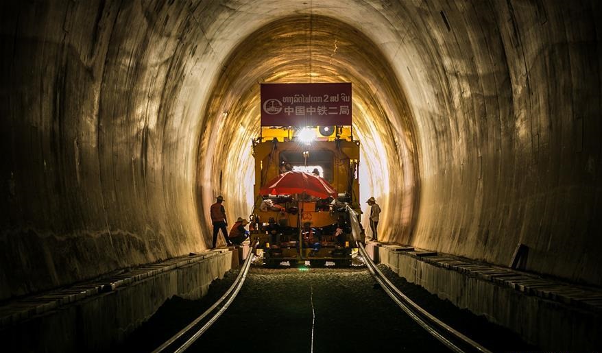 5月23日,在老撾萬象省庚凱村隧道的中老鐵路施工現(xiàn)場,中老兩國工人協(xié)力鋪軌。 隨著每排14根軌枕按照規(guī)定距離平穩(wěn)鋪過庚凱村隧道,500米長鋼軌隨著牽引機穩(wěn)準(zhǔn)落定,中老鐵路鋪軌23日通過第一座隧道,從老撾首都萬象一路向北。 新華社發(fā)(凱喬攝)