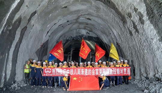 7月23日,中國(guó)中鐵八局員工在老撾北部烏多姆賽省貫通會(huì)富萊隧道后合影。 中老鐵路全線控制性工程——會(huì)富萊隧道23日貫通,為后續(xù)架梁鋪軌施工、實(shí)現(xiàn)2021年全線通車目標(biāo)創(chuàng)造條件。 新華社發(fā)(中鐵八局供圖)