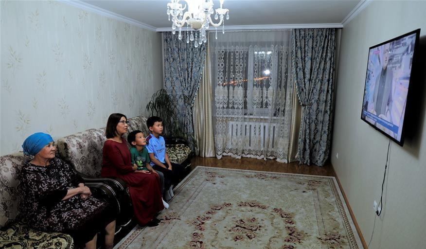 10月9日,在哈薩克斯坦努爾蘇丹,當(dāng)?shù)鼐用裨诩抑杏^看“一帶一路”紀錄片《你好,哈薩克斯坦》。