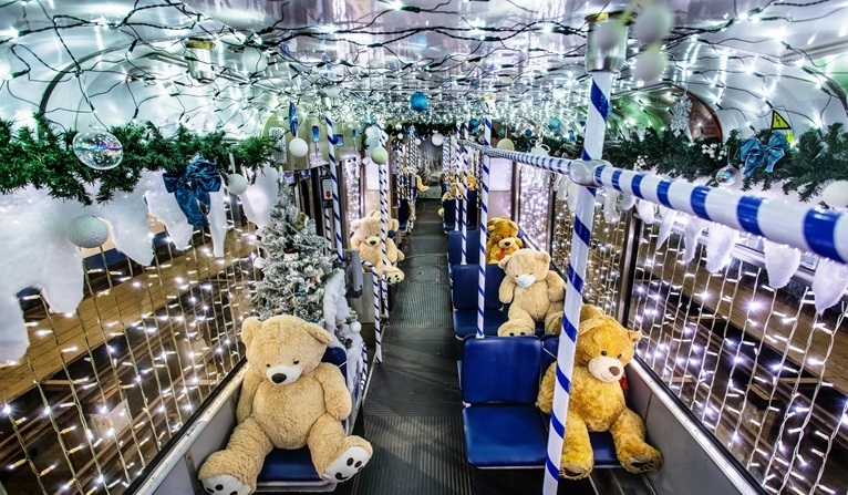 當(dāng)?shù)貢r間12月9日,克羅地亞奧西耶克,為了迎接圣誕節(jié),當(dāng)?shù)仉娷噧?nèi)外都被裝飾一新,并在車上的座位擺放泰迪熊玩偶。(圖片來源:東方IC)