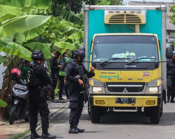 1月4日,在印度尼西亞?wèn)|爪哇省泗水市,當(dāng)?shù)鼐熳o(hù)送裝有新冠疫苗的車輛。