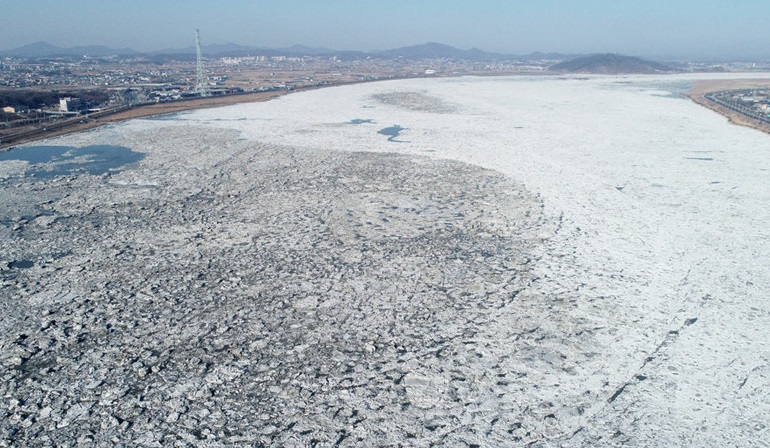 人民網(wǎng)訊 當(dāng)?shù)貢r(shí)間1月17日,韓國首爾當(dāng)天早晨氣溫達(dá)到零下10度,漢江面被薄冰覆蓋。
