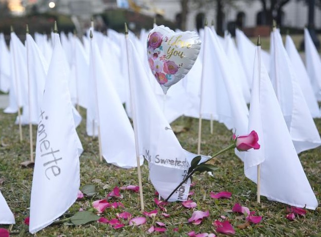 1月19日,在美國(guó)路易斯安那州新奧爾良市舉行的新冠逝者悼念儀式上,氣球和花被放置在白旗周圍。新奧爾良市拉斐特廣場(chǎng)上布置了近700面白色旗幟,用以紀(jì)念在疫情中喪生的新奧爾良人。