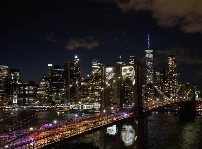 3月14日,新冠逝者的照片在紀(jì)念活動上被投射到美國紐約布魯克林大橋上。新華社發(fā)(郭克攝)