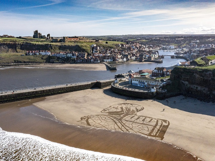 人民網(wǎng)訊 當?shù)貢r間3月15日,英國惠特比,在世界水日來臨之前,水援助組織在惠特比海灘的沙灘上創(chuàng)作了一幅畫,畫中的孩子在漲潮的潮水旁提水,以強調(diào)氣候變化對人們獲取水的影響。