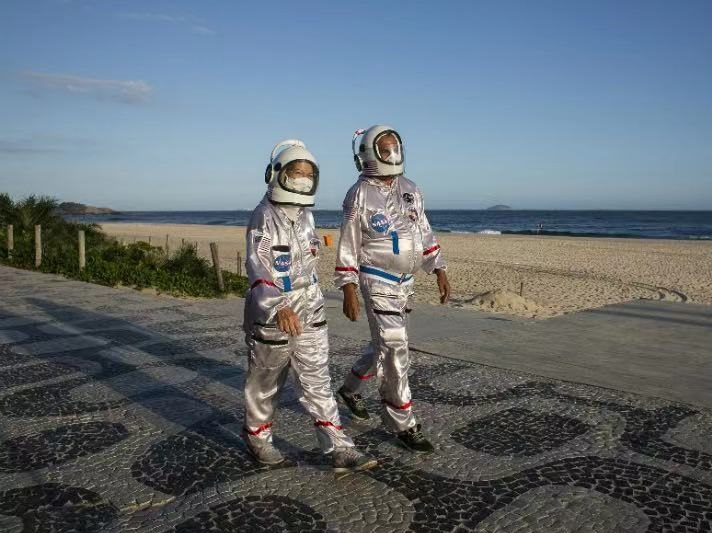 人民網訊 當?shù)貢r間2021年3月20日,巴西里約熱內盧,Tercio Galdino與妻子Alicea著太空服裝扮出行伊帕尼瑪海灘,在保護自己免受新冠感染的同時呼吁民眾加強防疫。