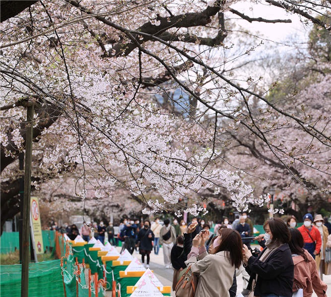 人民網(wǎng)訊 當(dāng)?shù)貢r(shí)間3月22日,日本東京,當(dāng)?shù)貦鸦ㄊ㈤_(kāi),吸引不少民眾前來(lái)賞櫻。