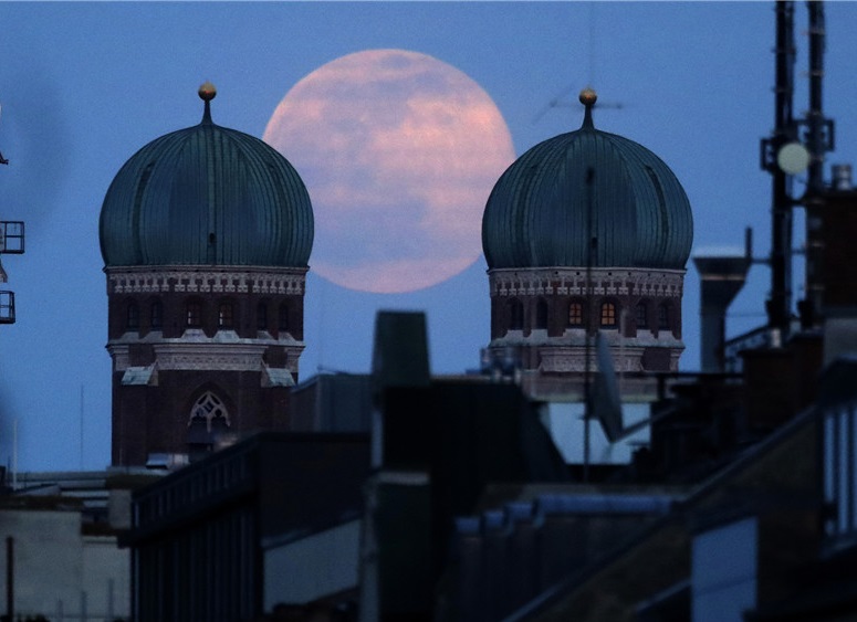 人民網(wǎng)訊 當?shù)貢r間3月28日,德國慕尼黑,滿月從圣母教堂后升起。
