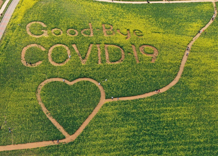 人民網(wǎng)訊 當(dāng)?shù)貢r(shí)間4月18日,韓國(guó)京畿道南部安城市,航拍鏡頭記錄下當(dāng)?shù)赜筒嘶ㄌ锢铩癎ood-Bye COVID-19”(新冠病毒,再見)的字樣。