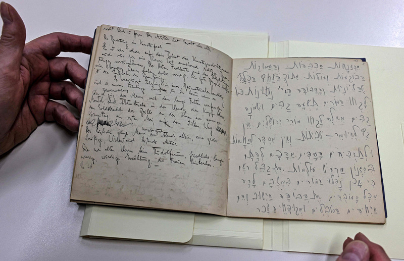 人民網(wǎng)訊 當?shù)貢r間5月31日,耶路撒冷地區(qū),以色列國家圖書館的博士修復(fù)并首次展示了捷克德語小說家弗朗茨·卡夫卡用希伯來文(右)和德語(左)所寫的原稿。