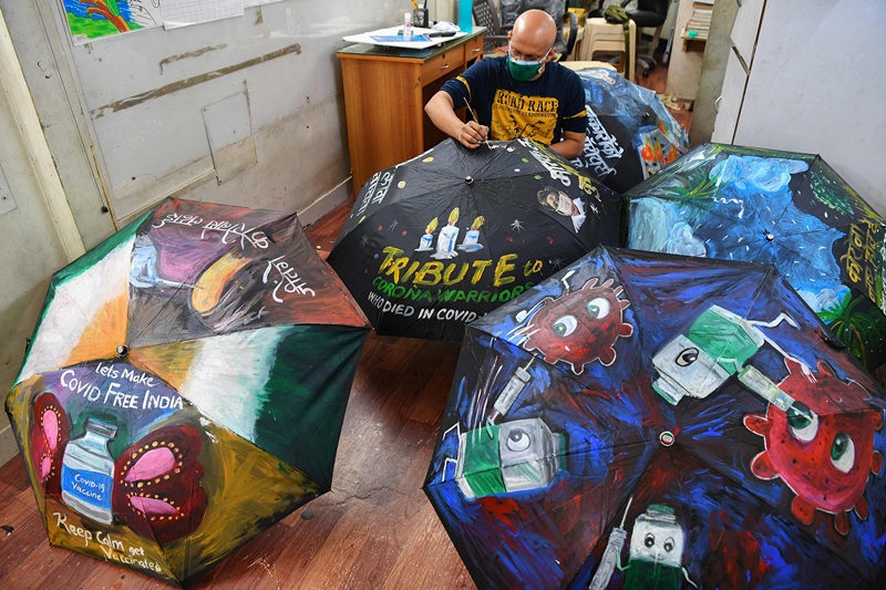 人民網訊 當?shù)貢r間6月3日,印度孟買,一所藝術學校里的藝術老師Sagar Kambli繪制新冠疫苗防疫主題雨傘,以提醒學生們通過接種新冠疫苗防疫。