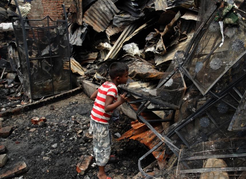 6月7日,一名兒童在孟加拉國首都達卡發(fā)生火災的貧民窟廢墟中尋找個人物品。