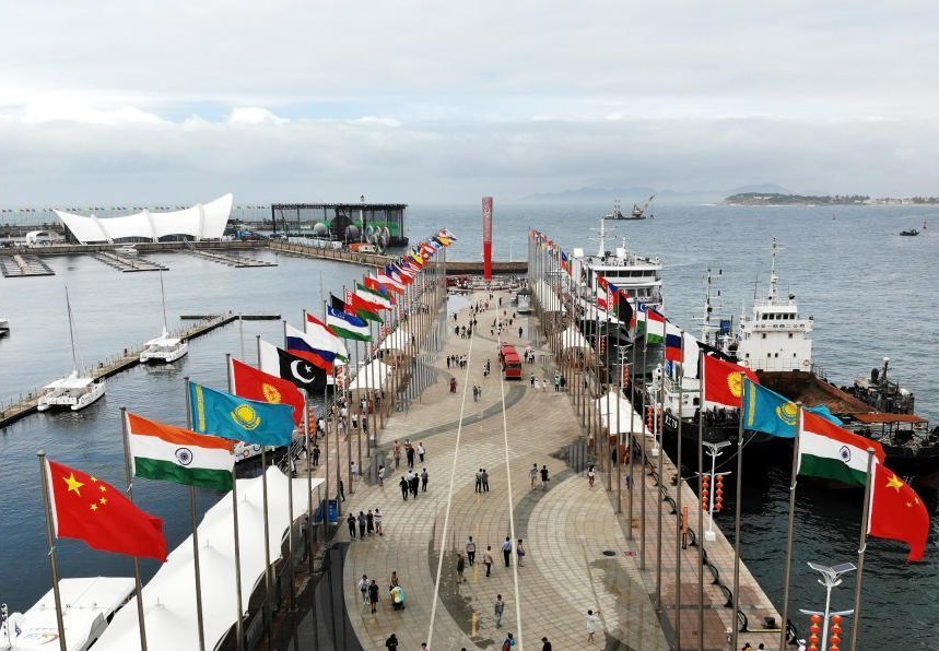 游客在青島奧帆中心旗陣廣場(chǎng)游覽(2018年7月1日攝,無(wú)人機(jī)照片)。新華社記者 李紫恒 攝