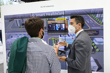 6月28日,在西班牙巴塞羅那,工作人員(右)在世界移動(dòng)通信大會(huì)華為展廳介紹5G技術(shù)與智慧醫(yī)療。
