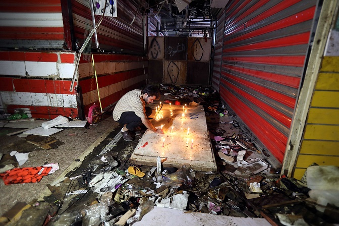 7月19日,在伊拉克首都巴格達東郊一市場,一名男子點燃蠟燭。