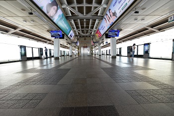 這是7月20日在泰國曼谷拍攝的乘客稀少的輕軌車站。