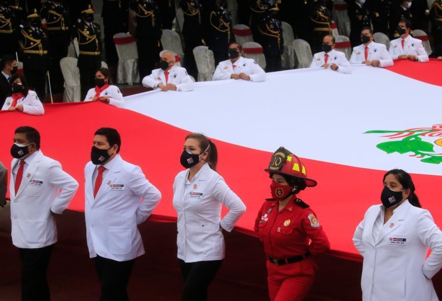 7月30日,在秘魯首都利馬陸軍總部,參加過(guò)抗疫的醫(yī)務(wù)人員和軍人舉著秘魯國(guó)旗參加閱兵式。