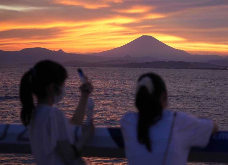 人民網(wǎng)北京8月7日電 當(dāng)?shù)貢r(shí)間8月5日,日本江之島,民眾眺望富士山夕陽(yáng),落日余暉晚霞醉人。