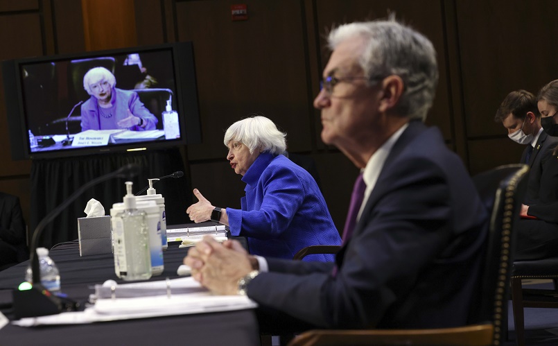 9月28日,美國財(cái)政部長耶倫(左一)在華盛頓出席國會(huì)參議院銀行、住房和城市事務(wù)委員會(huì)聽證會(huì)。