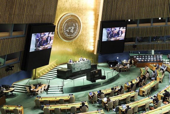 10月7日,在位于紐約的聯(lián)合國(guó)總部,中國(guó)常駐聯(lián)合國(guó)代表張軍(屏幕上)在第76屆聯(lián)合國(guó)大會(huì)第三委員會(huì)一般性辯論中發(fā)言。