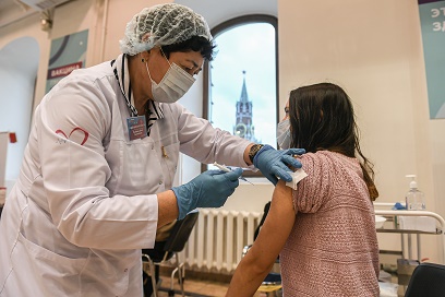 11月4日,在俄羅斯首都莫斯科的古姆百貨商場,一名女子接種新冠疫苗。