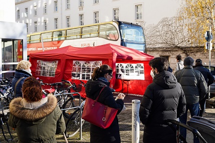 11月22日,人們?cè)诘聡?guó)首都柏林一輛“疫苗巴士”前排隊(duì)等待接種新冠疫苗。